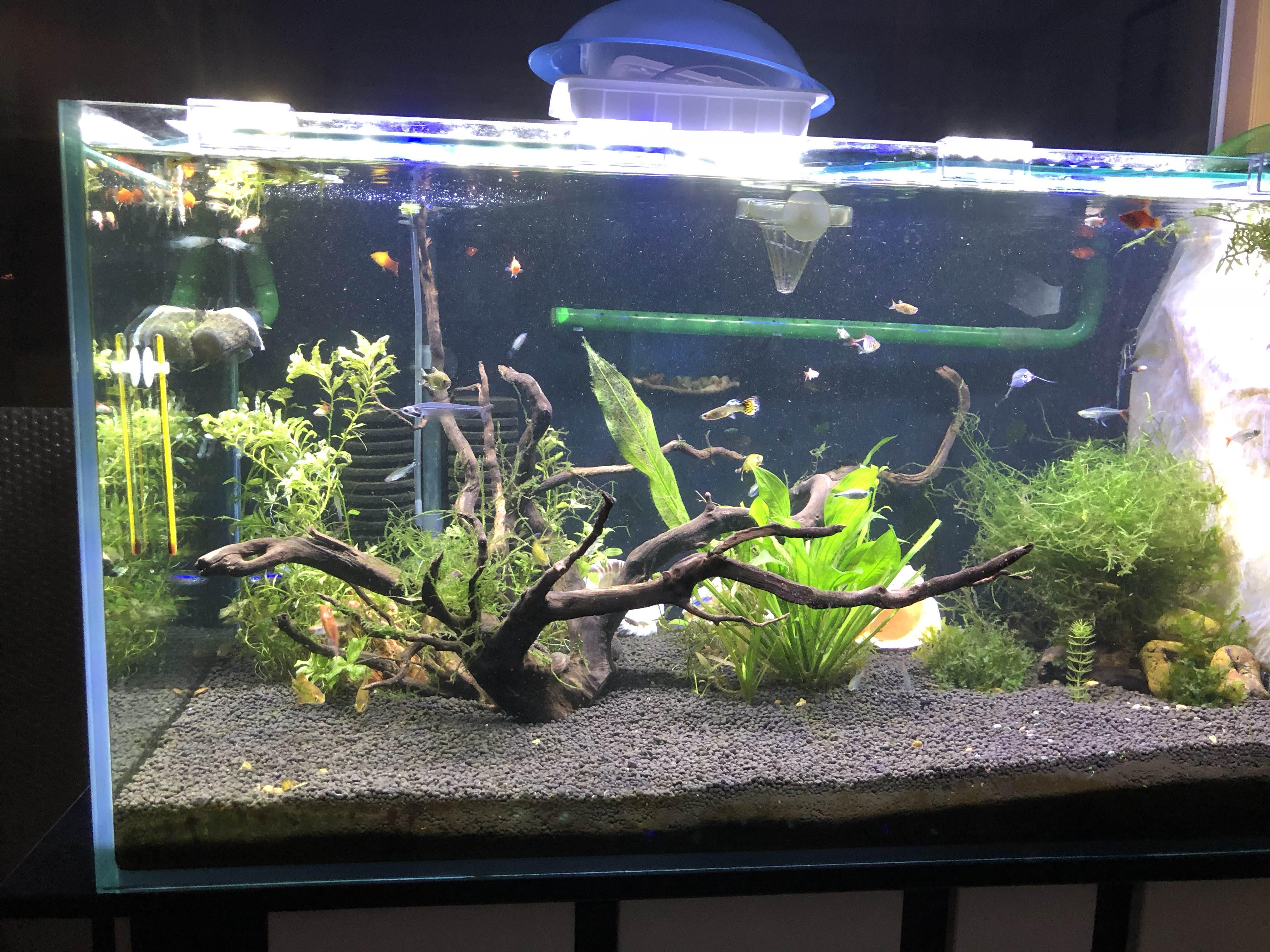 그런데, 작은 열대어들과 새우들을 마구마구 투입하면서 이 친구들이 씨앗수초들을 살살 건드려 뽑기 시작했다ㅠㅠ 둥둥 물위에 떠있는 수초들은 뿌리가 비교적 깊지 않아 계속해서 뽑혀나갔고… 뜰채로 건져내기 바빴다ㅠㅠ