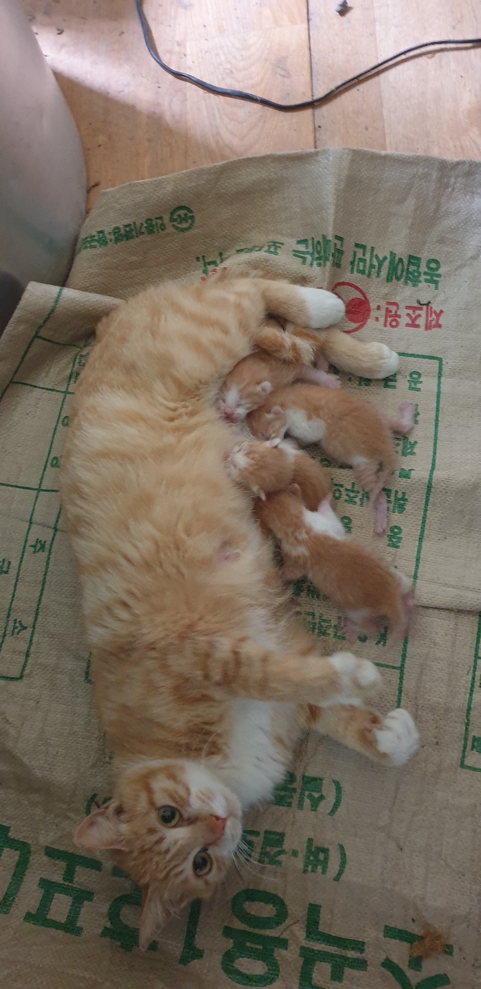 어느 날은 출산의 소식을 알렸다. 아랫 동네에 아빠 고양이가 있었던 것 같은데 새끼들을 보니 색이 비슷한 듯 하다. 작은 녀석이 더 쬐끄마한 새끼들을 낳아 젖을 먹이는 걸 보니 가슴이 뭉클했다.